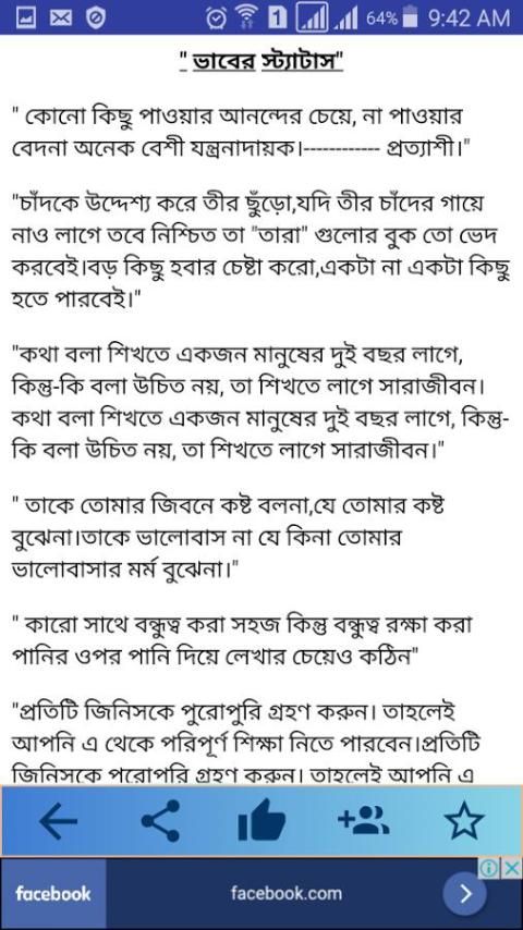 Это коллекция статуса facebook и смс Bangla. В этом приложении вы получите новый статус пост Bangla facebook, Bangla SMS, Twitter пост, Ид SMS Ид статус и т.д.