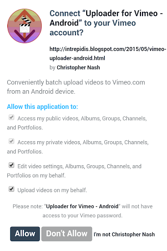 Загрузите видео на сайт Vimeo.com.Процесс загрузки осуществляется на заднем плане, с постоянным уведомлением, чтобы вы могли держать вас в курсе прогресса.Несколько видео могут быть зарегистрированы для последовательной загрузки.