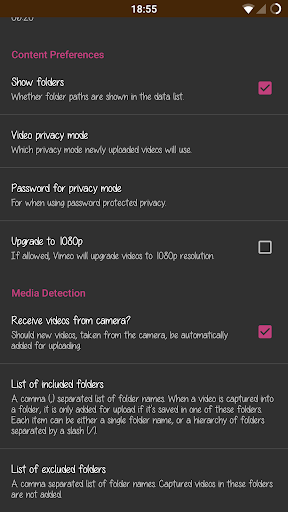 По умолчанию приложение автоматически добавит все видео, которые захватываются камерой устройства, и загружают их на свою учетную запись Vimeo после доступности сети WiFi.Это поведение настраивается.Таким образом, можно допуститься только для разрешения Wi-Fi, или также разрешить загрузку по мобильной мобильной сотовой сети.Можно отключить автоматическое добавление захваченных видео.Существуют различные другие настройки.