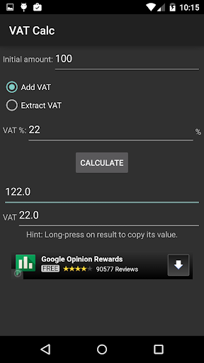 Easily calculate the VAT with this app in few taps. Just insert the initial amount, choose to add or to extract VAT and the VAT percentage. Please comment if you have any problem or you want to propose a new feature. Thank you :)
