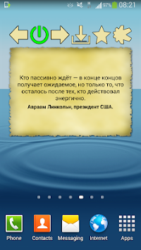 "Цитаты успешных людей" - приложение, сделанное в виде виджета, которое по своей сути представляет бизнес цитатник, в котором собрано 269 цитат людей, достигших успеха в бизнесе, политике и других областях человеческой деятельности. Для удобства использования, приложение сделано в виде виджета, в котором легко навигироваться между цитатами или запустить их автоматическое обновление.