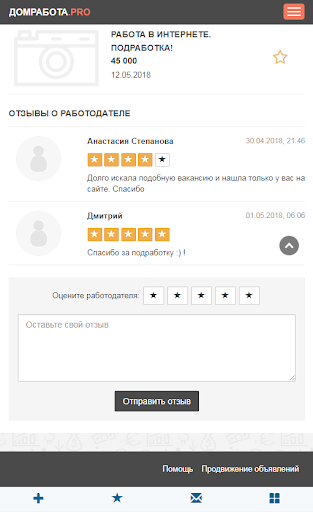 Работа на дому удаленно в интернете или без него . Актуальные вакансии от работодателей и резюме от людей, ищущих работу на дому. Оценка вакансий от 1 до 5 , отзывы работодателей. Удобный интерфейс.