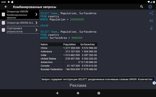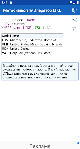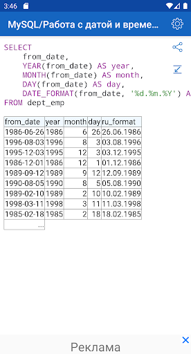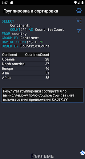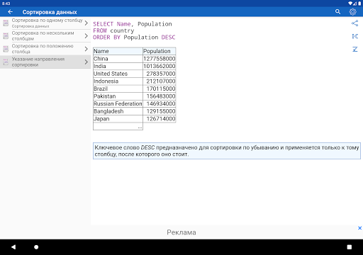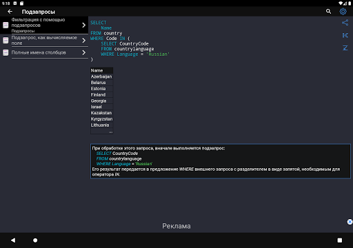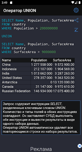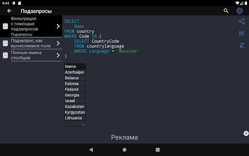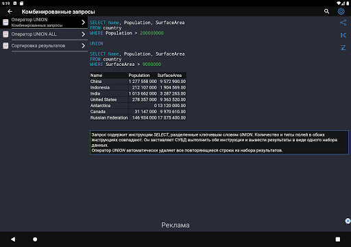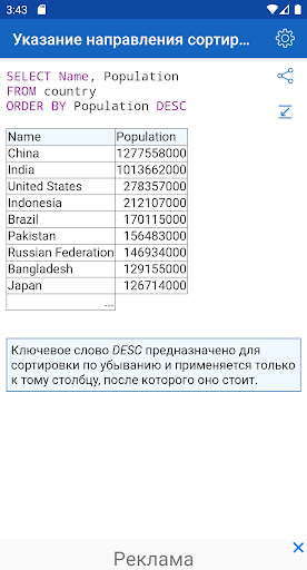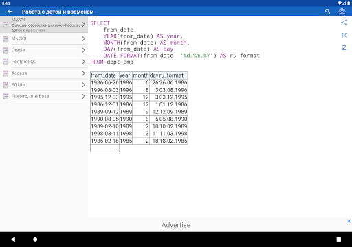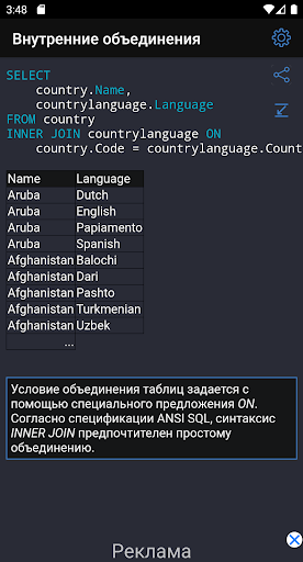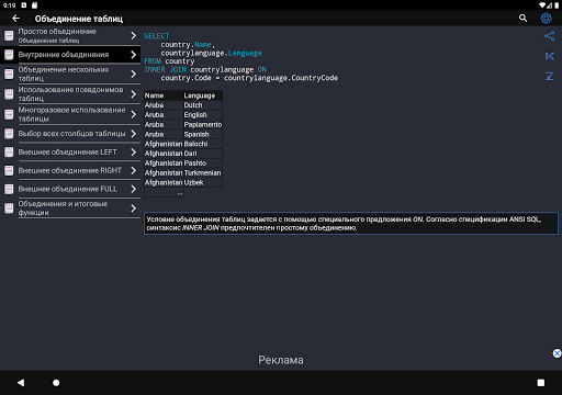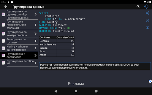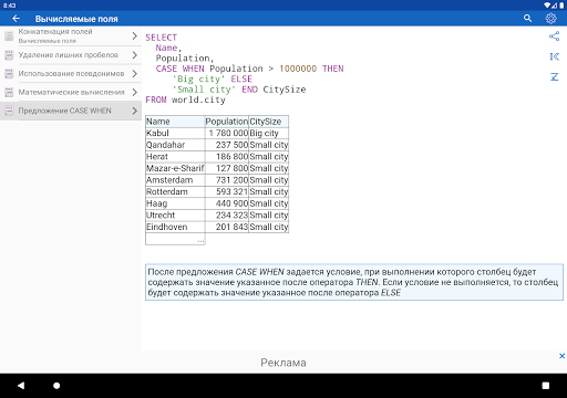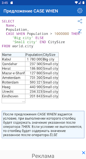 ✓ Изучение синтаксиса SQL на конкретных примерах кода. Как объединить несколько таблиц в одном запросе? Как отсортировать результат группировки данных? Какие типы данных есть в СУБД SQL Server? В приложении доступны эти и еще более 150 примеров запросов на языке SQL.