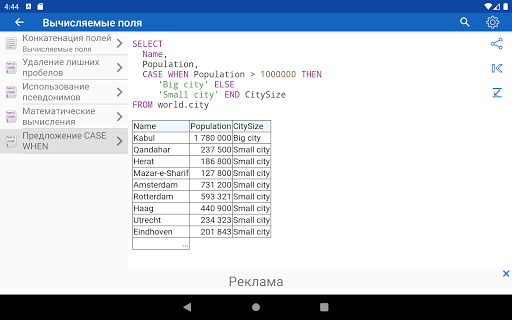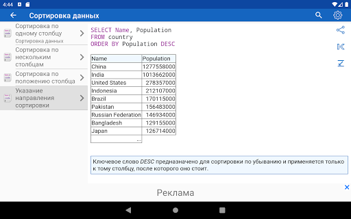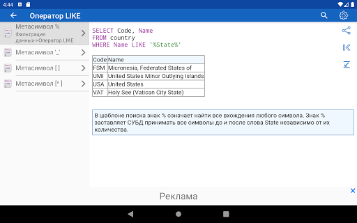 ✓ Приложение является хорошим пособием при сдаче экзамена или подготовке к собеседованию, т.к. содержит справочник типовых, часто используемых операций на языке SQL.