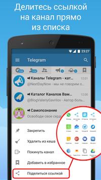 ● Вы можете поделится ссылкой на любой канал прямо из списка каналов, используя при этом любое приложение для связи. Для этого просто нажмите на него и подождите пока появится выпадающее меню;