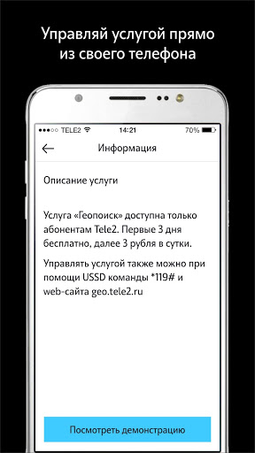 Услуга Геопоиск доступна только абонентам Tele2. Первые 3 дня бесплатно, далее 3 рубля в день.