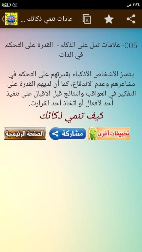 There are individual differences between individuals in the level of mental performance IQ and IQ ratios, and this ratio varies according to various reasons, perhaps the most prominent are genetic causes, and at the beginning of our application we offer you the most famous signs of intelligence in general and then touch on ways to develop intelligence for adults and children and how to develop your imagination. At the end of the app a warning of habits kill intelligence.