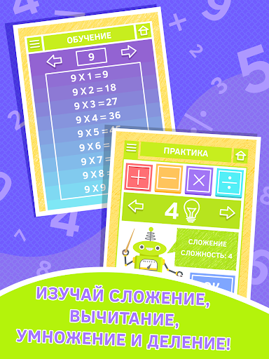- Три игровых режима для тренировки математических навыков: обучение, практика и экзамен