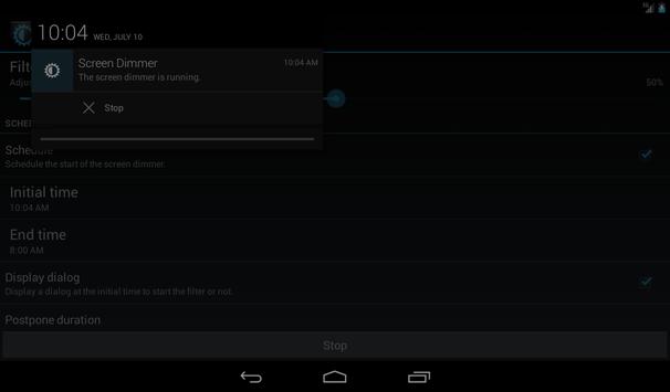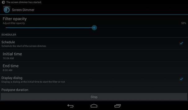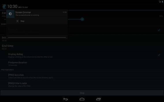 Enhanced notification : click on the brightness icon to stop Screen Dimmer or click on the progress bar to change the filter's opacity.