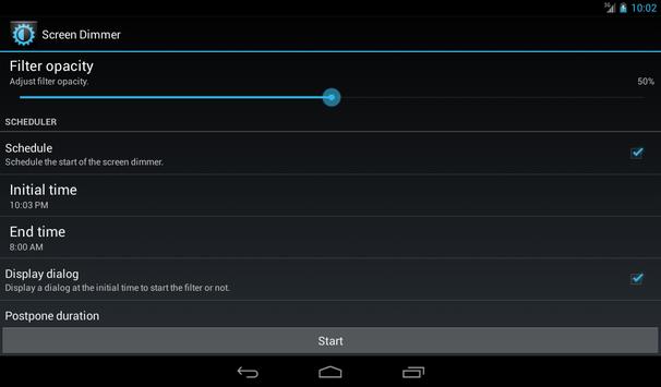 Screen Dimmer enable you to lower the brightness of your phone or tablet more than what you can do by default in order to avoid headache and eye pain in a dark environment or at night. If you own an Amoled screen, this app will even save your battery because black pixels actually turn off on an