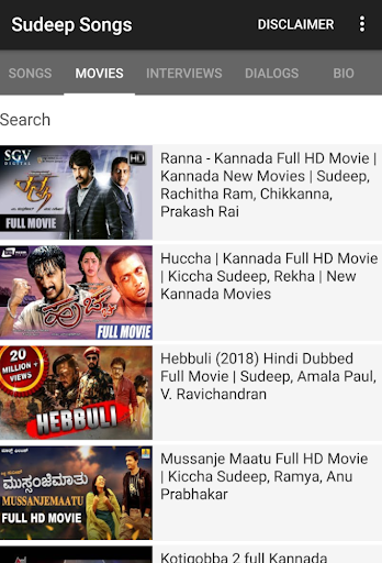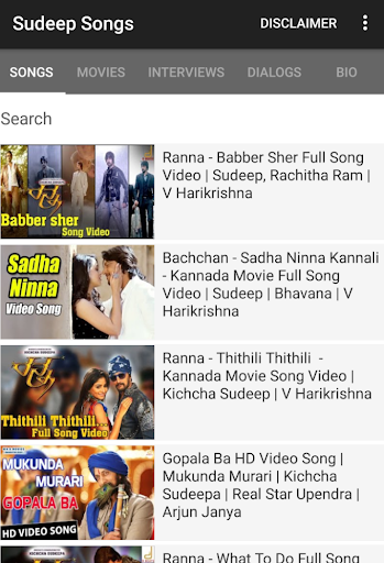 Has more than 200 top Kannada songs by Sudeep. You can you search bar to filter songs you want to watch.