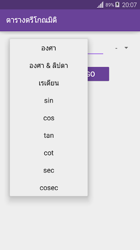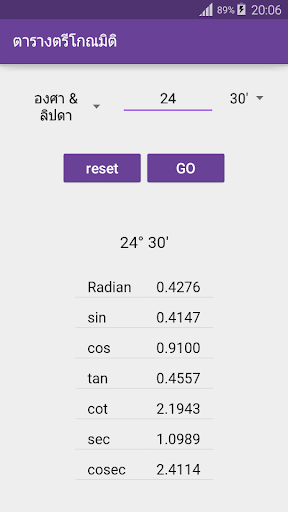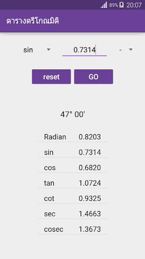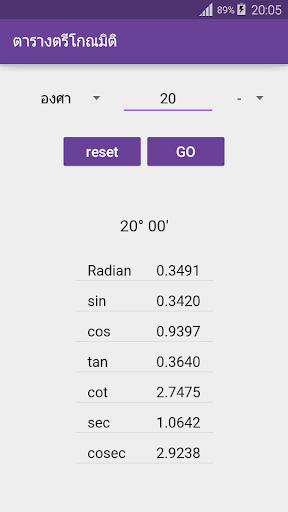 ไม่ต้องพบหนังสือเล่มหนา ไม่ต้องเพ่งตารางจนตาลาย เพียงแค่มีแอพพลิเคชันตารางตรีโกณมิติคุณก็สามารถค้นหาค่าตรีโกณมิติที่ต้องการได้ง่ายๆ แค่กรองค่า องศาและลิปดา หรือหากคุณต้องการค้นหาจากค่าอื่น 'ตารางตรีโกณมิติ' ก็มี เรเดียน, sin, cos, tan, cot, sec และ cosec ให้คุณเลือกค้นหาเช่นกัน