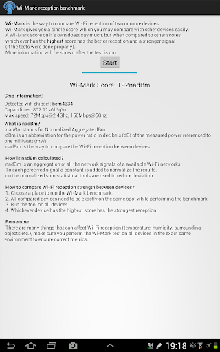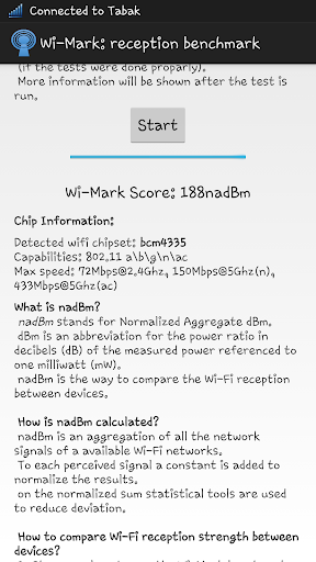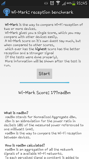 Wi-Mark gives a score in the form of nadBm, which is easily comparable with other devices. Which ever has the highest nadBm in the exact same environment has the better Wi-Fi reception.