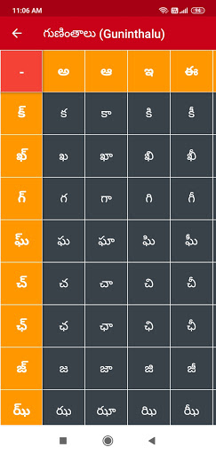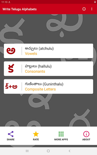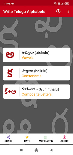 - คุณสามารถฝึกฝนการเขียนสระเตลูกูและพยัญชนะแอปมีเสียงสำหรับแต่ละตัวอักษรเตลูกู