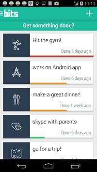 When a task is finished, just swipe 'Done' and let Bits takes care of keeping all your goals in order. Bits will give you instant feedback and celebrate your victories with you!