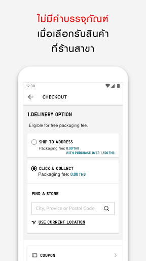 เลือกรับสินค้าตามที่อยู่ของคุณหรือเลือกรับสินค้าที่ร้านยูนิโคล่ด้วยบริการ Click&Collect ไม่มีค่าจัดส่ง