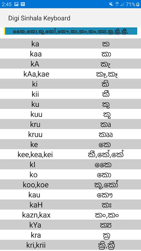 Gumagamit kami ng Transliteration Language Technology Research Laboratory - University of Colombo School of Computing Sri Lanka real time font Unicode converter transliterated (singlish scheme) Mga tunog ng vowel, auxiliaries, consonants, deriving consonants.