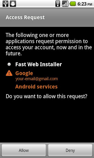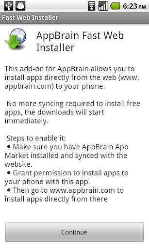 Install free apps directly from appbrain.com in your web browser to your phone.\nNow also works for google play (the new android market).\nSee developers webpage (below) for more info. Credentials are needed to grant permission to do fast web install via AppBrain, the FAQ has more info.\nPlease email us for problems.\nkw: APK installer, apkinstaller, fast web installer