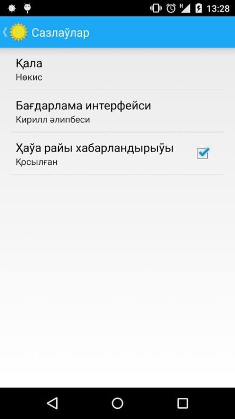 Hawa Rayi бул Android платформасы ушын Қарақалпақстан қалаларындағы ҳаӯа райын бақлаӯ бағдарламасы. Бағдарлама ашық-дерекли Sunshine (https://github.com/udacity/Sunshine) бағдарламасына тийкарланған болып, төмендеги мүмкиншиликлерди өз ишине алған: