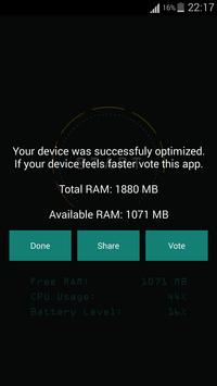 Easy speed up your device, free up the RAM memory. With 1 tap on START button the device will get a significant Boost and Optimization