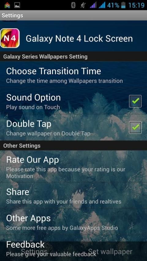 This Live Wallpaper Contains images from Glaxy Note 4. You people can use these walls to make your phone beautiful,dashing and Crisp ! It gives a charming look to your Phone.