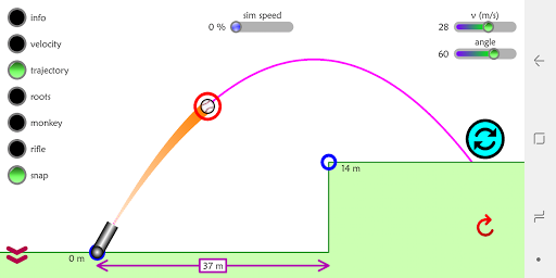 12) Snap – snaps the velocity and angle sliders to the nearest 2 m/s and 5 degrees.
