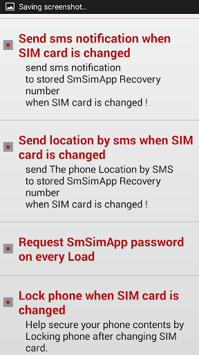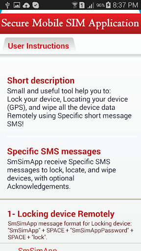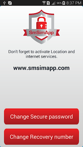 Secure Mobile SIM application SMSIMAPP ay isang kumpletong anti-theft application, ang pinakamahusay na proteksyon maaari mong makuha upang mabawi ang iyong mga nailagay sa ibang lugar, nawala o ninakaw na Android device. Ito ay hindi lamang isang "mahanap ang aking telepono" app o isang tracker ng telepono, SMSimApp ay may maraming mga natatanging mga tampok na gawin itong ang perpektong app upang mahanap ang iyong telepono o tablet, kontrolin ang iyong cell phone malayuan, pamahalaan ang iyong aparato sa pamamagitan ng isang web-based na interface o SMS Kung ang telepono ay ninakaw (gawin ito, pumunta sa: www.smsimapp.com). I-lock o i-wipe ang SD card at ang memorya ng telepono, upang mapanatiling ligtas ang iyong data. Mag-set up ng isang sub-card-change notification sa isa pang device, malayuan kumuha ng litrato. Kilalanin ang magnanakaw at ibalik ang iyong aparato.