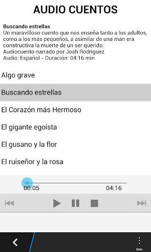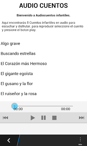 Dito makikita mo ang 8 mga kuwento ng bata sa audio upang makinig at magsaya. Upang i-play piliin ang kuwento at pindutin ang pindutan ng pag-play. Hindi kailangan ang koneksyon sa internet upang makinig sa mga kuwento dahil maaari kang makinig sa offline nang walang koneksyon.