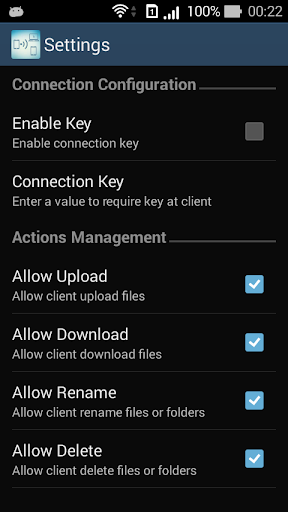 To security your device, Files Transfer provides settings to you can allow actions as well as require a key when other devices connect to your android phone
