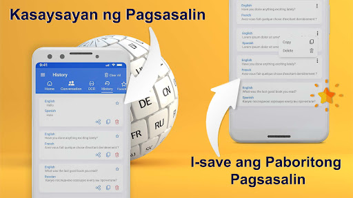Lahat ng Languages Voice translator feature ay maaaring gamitin para sa mabilis na pagsasalin at ito ay napakadali para sa iba't ibang wika. I-tab mo lang ang speak button at bigkasin ang mga salita o simpleng tagasalin ng pangungusap at isasalin nito ang iyong pangungusap sa nais na wika. Maaari mong kopyahin at ibahagi ang mga wikang ito na isinalin na teksto sa iyong mga kaibigan at pamilya