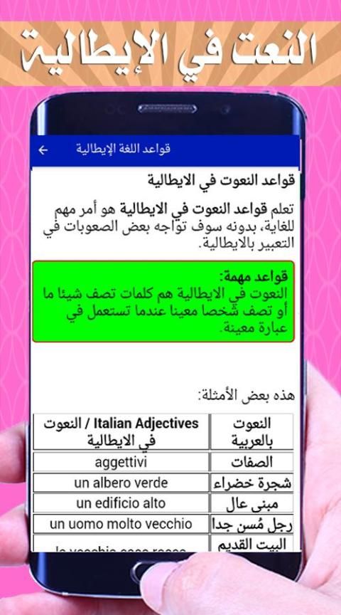 In addition the program includes learning the Italian language for beginners on many lessons through Arabic translation Italian without the Internet, which makes you able to rapid understanding of these circumstances language for those who Abhton on the application using different phrases, they can through the use of words that are underneath: Education Learn Italian Arabic , Italian translation Arabic, educational programs for children