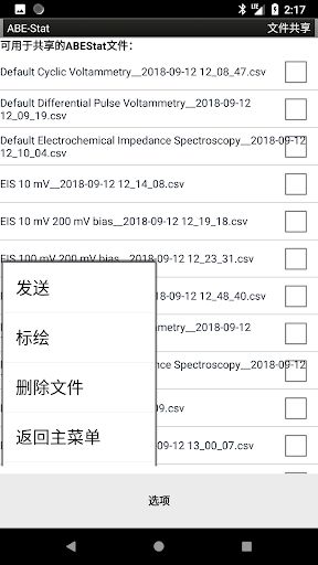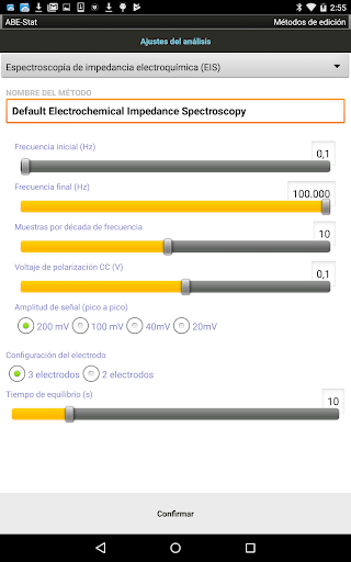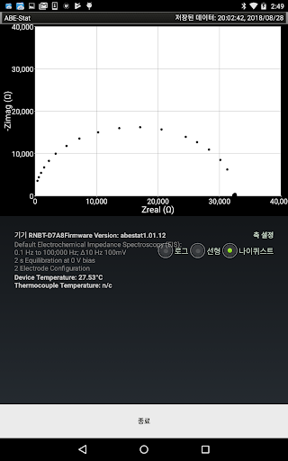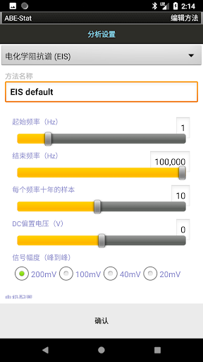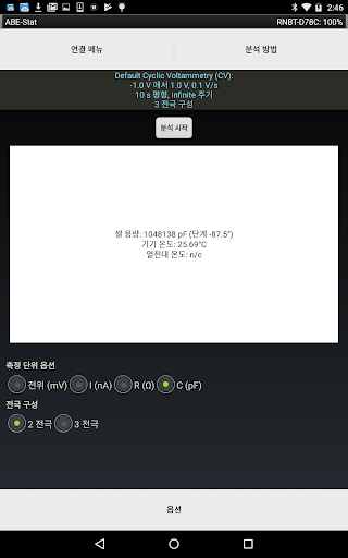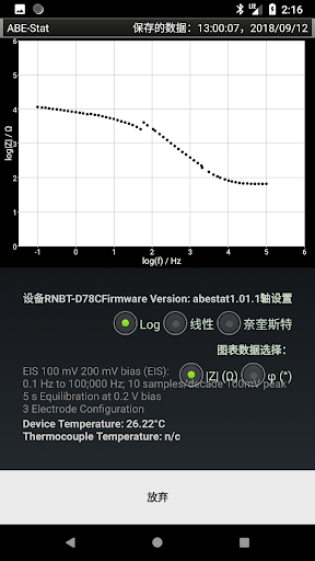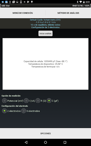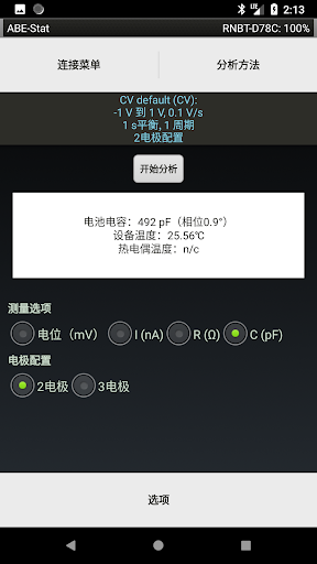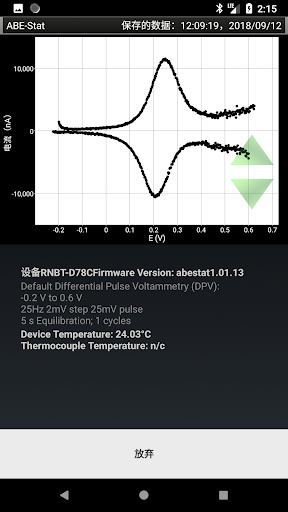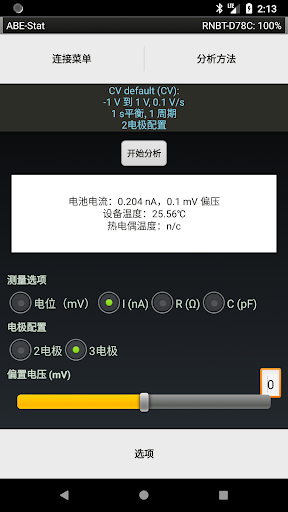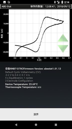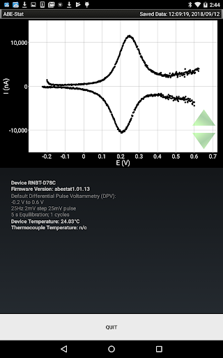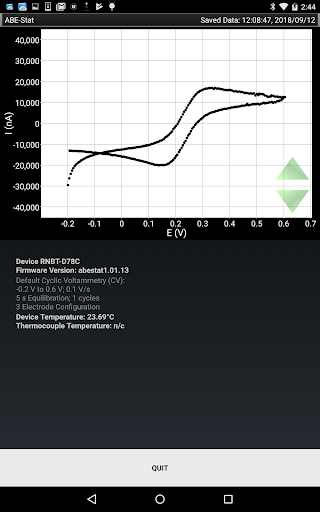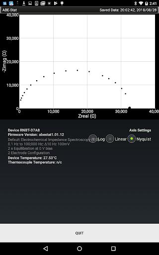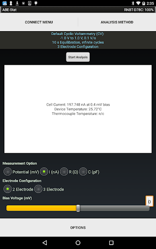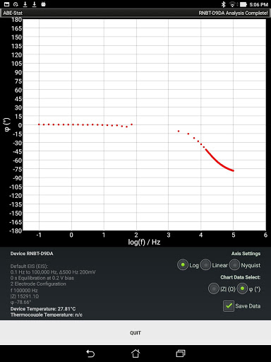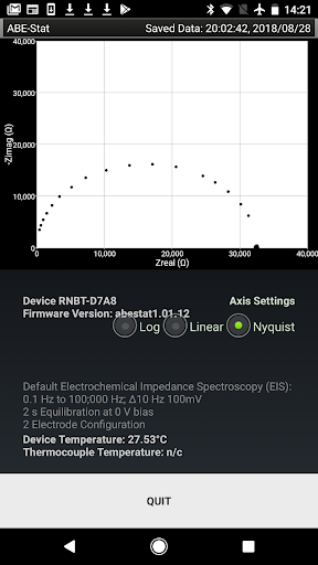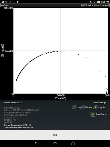 Interface for setting the parameters, recording, and viewing data for electrochemical analysis with the customized ABE-Stat hardware. Analyses include cyclic voltammetry, differential pulse voltammetry, and electrochemical impedance spectroscopy. In addition, the hardware (and Android interface) can perform basic multimeter like functions such as determining resistance and capacitance, open circuit voltage, thermocouple temperature measurement, and current at applied DC bias, for any two or three electrode terminal network.