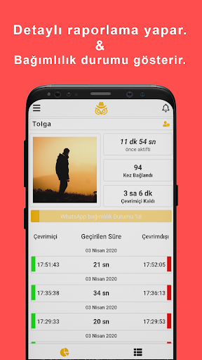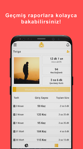 Uygulamada ne kadar zaman harcadığınızı whatsapp için takip uygulaması ile öğrenebilirsiniz. Bunun için çevrimiçi ve çevrimdışı hareketlerinizde bildirim alabilirsiniz. Uygulama giriş ve çıkışları günlük olarak rapor tutar, geçmiş raporlara kolayca erişebilirsiniz. Bu sayede whatsapp için uygulamada ne kadar zaman harcadığınızı anlık olarak izleyebilirsiniz.