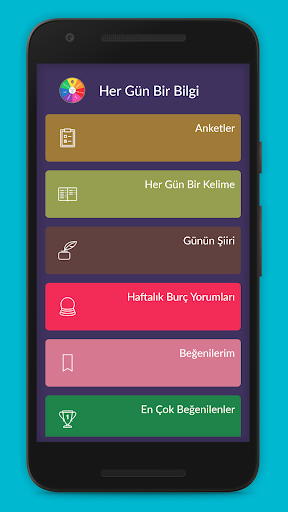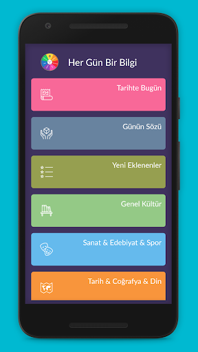 Uygulamamızda Tarihte Bugün, Günün Sözü, Genel Kültür, Sanat & Edebiyat & Spor, Tarih & Coğrafya & Din, Anketler, Her Gün Bir Kelime, Günün Şiiri, Haftalık Burç Yorumları gibi birçok farklı kategori bulunmaktadır. Her gün farklı kategorilerde birden çok bilgiye erişebilirsiniz.