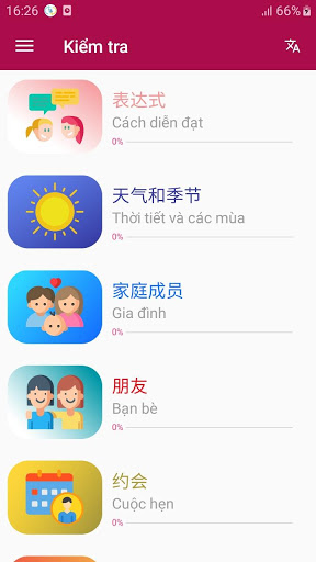 "Người" "Gia đình" "Làm quen" "Ở trường học" "Đất nước và ngôn ngữ" "Đọc và viết" "Số" "Giờ" "Ngày trong tuần" "Hôm qua – Hôm nay – Ngày mai" "Tháng" "Đồ uống" "Công việc" "Màu" "Hoa quả / Trái cây và thực phẩm" "Mùa trong năm và thời tiết" "Ở trong nhà" "Dọn dẹp nhà" "Ở trong bếp" "Cuộc nói chuyện nhỏ 1" "Cuộc nói chuyện nhỏ 2" "Cuộc nói chuyện nhỏ 3" "Học ngôn ngữ" "Cuộc hẹn" "Ở trong phố" "Trong thiên nhiên" "Ở khách sạn – sự tới nơi" "Ở khách sạn – sự than phiền" "Ở trong quán ăn 1" "Ở trong quán ăn 2" "Ở trong quán ăn 3" "Ở trong quán ăn 4" "Ở nhà ga" "Ở trong tàu hỏa / xe lửa" "Ở sân bay" "Giao thông công cộng khu vực gần" "Đang trên đường đi" "Ở trong tắc xi" "Hỏng xe" "Hỏi thăm đường" "Sự định hướng" "Thăm quan thành phố" "Ở sở thú" "Đi chơi buổi tối." "Ở trong rạp chiếu phim" "Ở trong sàn nhảy" "Chuẩn bị đi du lịch" "Hoạt động khi nghỉ hè" "Thể thao" "Trong bể bơi" "Công việc nhỏ" "Ở trong cửa hàng bách hóa tổng hợp" "Các cửa hàng" "Mua sắm" "Làm việc" "Cảm giác" "Ở phòng khám bệnh" "Các bộ phận thân thể" "Ở bưu điện" "Trong ngân hàng" "Số thứ tự" "Đặt câu hỏi 1" "Đặt câu hỏi 2" "Phủ định 1" "Phủ định 2" "Đại từ sở hữu 1" "Đại từ sở hữu 2" "To – nhỏ" "Cần – muốn" "Muốn gì đó" "Muốn gì đó" "Bắt buộc cái gì đó" "Được phép làm gì đó" "Xin cái gì đó" "Biện hộ cái gì đó 1" "Biện hộ cái gì đó 2" "Biện hộ cái gì 3" "Tính từ 1" "Tính từ 2" "Tính từ 3" "Quá khứ 1" "Quá khứ 2" "Quá khứ 3" "Quá khứ 4" "Câu hỏi – Quá khứ 1" "Câu hỏi – Quá khứ 2" "Quá khứ của động từ cách thức 1" "Quá khứ của động từ cách thức 2" "Mệnh lệnh 1" "Mệnh lệnh 2" "Mệnh đề phụ với rằng 1" "Mệnh đề phụ với rằng 2" "Mệnh đề phụ với liệu" "Liên từ 1" "Liên từ 2" "Liên từ 3" "Liên từ 4" "Liên từ kép" "Cách sở hữu" "Trạng từ"
