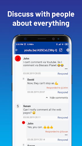 Thảo luận về hành tinh là một ứng dụng miễn phí, cho phép người dùng bày tỏ ý kiến, bình luận và thảo luận tự do với những người dùng khác mà không bị hạn chế về tất cả các trang web và bất kỳ nội dung nào trên Internet, bao gồm nội dung mà người tạo không cho phép hoặc bị cấm. Ví dụ: video YouTube, bài đăng trên Instagram, v.v., trong đó trình tạo đã vô hiệu hóa tùy chọn để tạo bình luận.