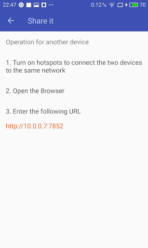 Whether text, music, image or video, movie or APP, you need only several taps to transmit documents. Now, just forget the troublesome transmission cable, as well as the slow Bluetooth, the APP consuming traffic and the application requiring to install software on PC! Why hesitate? Download EasyTransfer right now!