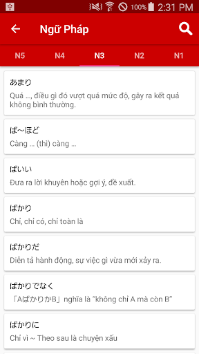 Ứng dụng học tiếng Nhật từ dễ đến khó Có đầy đủ ngữ pháp và bài tập từ N5 đến N1 Ứng dụng có thể học không cần wifi.