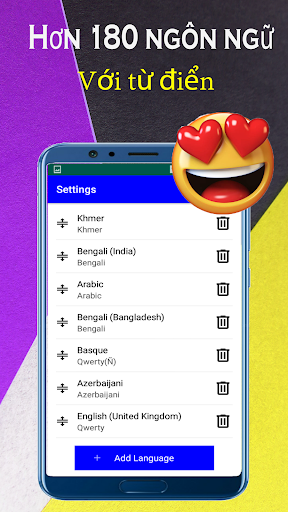 Bàn phím đa ngôn ngữ 2020 hỗ trợ nhiều ngôn ngữ. Bàn phím đa ngôn ngữ cho phép người dùng viết và nhập tin nhắn bằng tiếng Khmer, tiếng Bangla, tiếng Myanmar, tiếng Mông Cổ, tiếng Anh, tiếng Việt, tiếng Oriya, tiếng Azeri, tiếng Nepal, tiếng Ả Rập, tiếng Kurd, tiếng Indonesia, tiếng Gujarati, tiếng Hindi, tiếng Tây Ban Nha, tiếng Gruzia và hơn 170 ngôn ngữ . Bàn phím ngôn ngữ kép này một bàn phím lạ mắt là tất cả các bàn phím ngôn ngữ với biểu tượng cảm xúc mới. Bạn có thể nhập bất kỳ ngôn ngữ nào bằng bàn phím Chính của chúng tôi với các hình nền bàn phím và chủ đề bàn phím khác nhau và bàn phím ngôn ngữ kép với tất cả bàn phím ngôn ngữ 2020 cho Android có thể tăng tốc độ gõ của bạn. Thêm hình ảnh của bạn dưới dạng hình nền bàn phím ngôn ngữ kép với bàn phím đa ngôn ngữ tốt nhất Thưởng thức gõ tiếng Khmer và các ngôn ngữ đa ngôn ngữ hoặc thế giới khác như tiếng Khmer gõ Myanmar gõ tiếng Ả Rập bằng bàn phím đa ngôn ngữ hoặc đa ngôn ngữ tốt nhất. Bàn phím chính mới 2020 với văn bản gõ tiếng Anh, văn bản gõ tiếng Mông Cổ, biểu tượng cảm xúc phông chữ đẹp mắt và chủ đề mới nhất. Thưởng thức tiếng gõ gõ Tiếng Ả Rập gõ Tiếng Hindi gõ tiếng Myanmar gõ Bàn phím đa ngôn ngữ mới tốt nhất 2020. Bàn phím ngữ âm hoàn toàn khác nhau và là bàn phím thực sự nhanh với chức năng tốt nhất của bàn phím đa ngôn ngữ này và tất cả ngôn ngữ. Một bàn phím nhanh với nhiều hỗ trợ ngôn ngữ. Bàn phím đa ngôn ngữ 2020 Tất cả bàn phím ngôn ngữ cung cấp gõ bàn phím nhanh. Đây là bàn phím mới nhất với từ điển và biểu tượng cảm xúc xuất sắc với nhiều bàn phím ngôn ngữ cho android và tất cả bàn phím ngôn ngữ 2020.