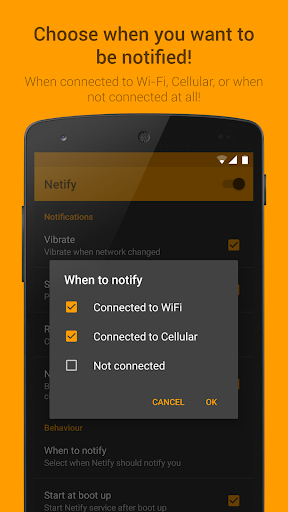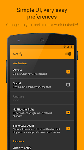 You can tell Netify when to notify you: only want to receive a notification when your device is connected via a cellular data network, or also when connected to Wi-Fi? Netify obeys your preferences!