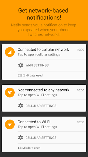 With the notifications from Netify you can quickly open your cellular data or Wi-Fi settings with just one tap. Turn Wi-Fi on, or quickly disable cellular data!