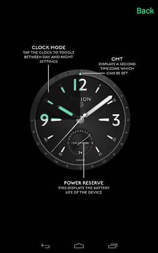 - Chức năng GMT: Mũi tên trên viền bên ngoài cho thấy GMT (thời gian trung bình Greenwich) theo mặc định và điều này Có thể được đặt dưới dạng Múi giờ thứ hai trong bảng Cài đặt của ứng dụng.