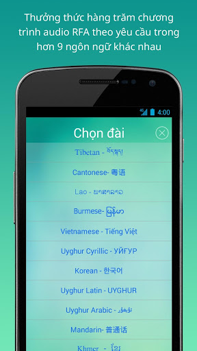 Ứng dụng RFA Mobile Streamer *chính thức* và miễn phí của RFA cung cấp tin tức phát thanh bằng 9 ngôn ngữ trên Android devices.