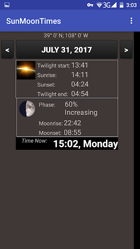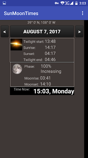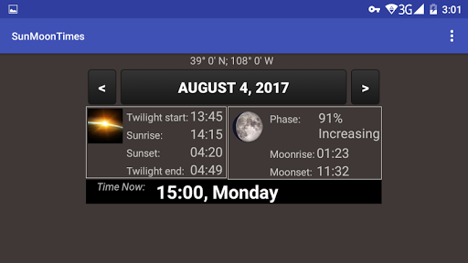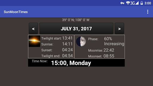 This app is useful not only for seeing current times but also for determining future full moon times or dark moon times. The same for sunset, sunrise etc. And you can do so for any location. Hunters, lovers and fishermen may find this app useful. You may use it in any manner you like for whatever purpose you choose.