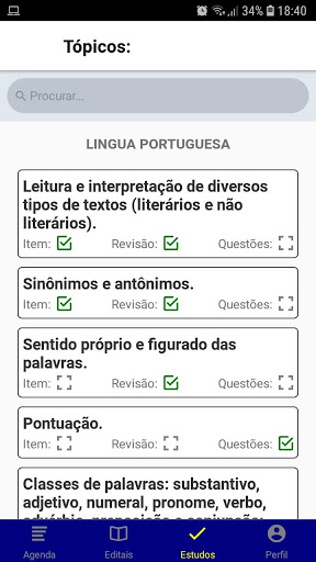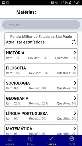 O aplicativo permite que usuário veja o percentual de avanço nos itens estudados, revisões e questões feitas de cada tópico da matéria. Tal controle é indispensável, pois permite que o usuário não se esqueça de estudar um tópico do edital por falta de controle.