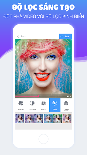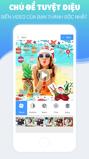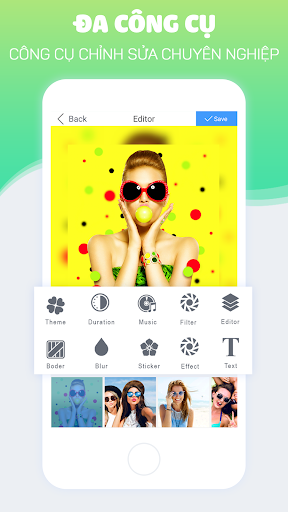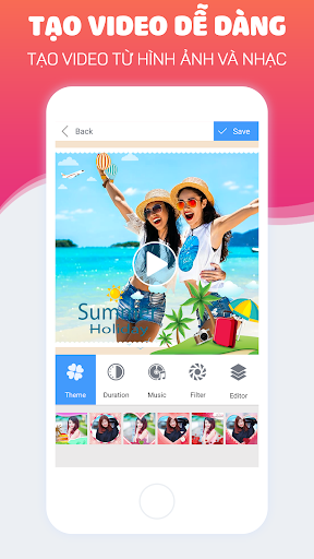 . Với ứng dụng lam video tu anh va nhac này bạn có thể dễ dàng để tạo video, chỉnh sửa video, làm đẹp video từ chính bộ sưu tập hình ảnh của bạn. Bạn đang được sử dụng ứng dụng chỉnh sửa video "Tất cả trong 1". Mọi thứ bạn cần để tạo ra một video tuyệt vời như thêm nhạc, thêm chữ, thêm hiệu ứng, khung ảnh...đều có trong ứng dụng này!