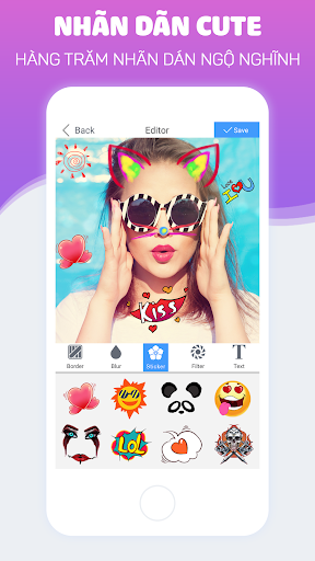 ✔ Ứng dụng có sẵn hơn 200 miếng dán về các chủ đề như: khuôn mặt mèo, mặt thỏ, mặt cún con, kính, đôi mắt, trái tim, biểu tượng cảm xúc, snap, b612 và nhiều miếng dán lung linh khác
