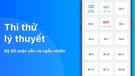 - Thi thử lý thuyết với bộ đề có sẵn hoặc ngẫu nhiên theo cấu trúc ra đề của Bộ Giao Thông Vận Tải, cho các loại bằng lái xe máy A1, A2, A3, A4; và ô tô B1, B2, C, D, E và F.