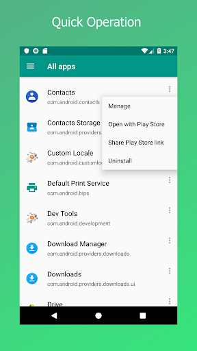 Trình quản lý gói ứng dụng đơn giản. Chức năng * Liệt kê ứng dụng đã cài đặt * Xem thông tin gói * Mở Cửa hàng phát từ thông tin gói * Gỡ cài đặt ứng dụng từ thông tin gói