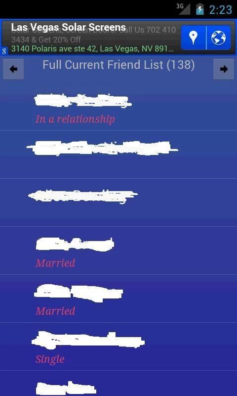 There is a summary screen and 4 lists (screens): Removed Friends, Added Friends and the full Current Facebook friend list and their relationship status and a birthday list. The full friend list might not be complete because of the way Facebook tracks a friend. The number you see in the app might be a bit lower.